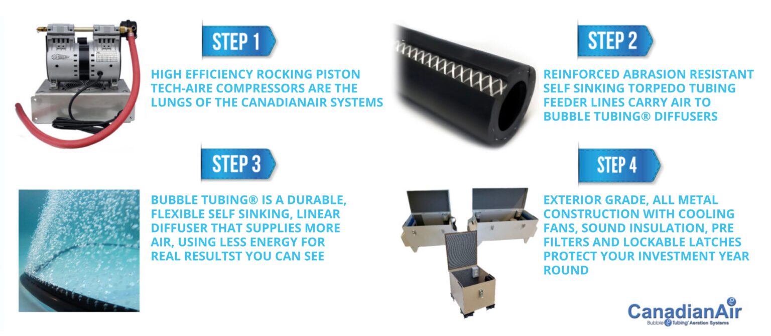 With no electricity or moving parts in the water, low power consumption, and low maintenance, and optional cabinets, the CanadianAir system offers a distinct advantage.