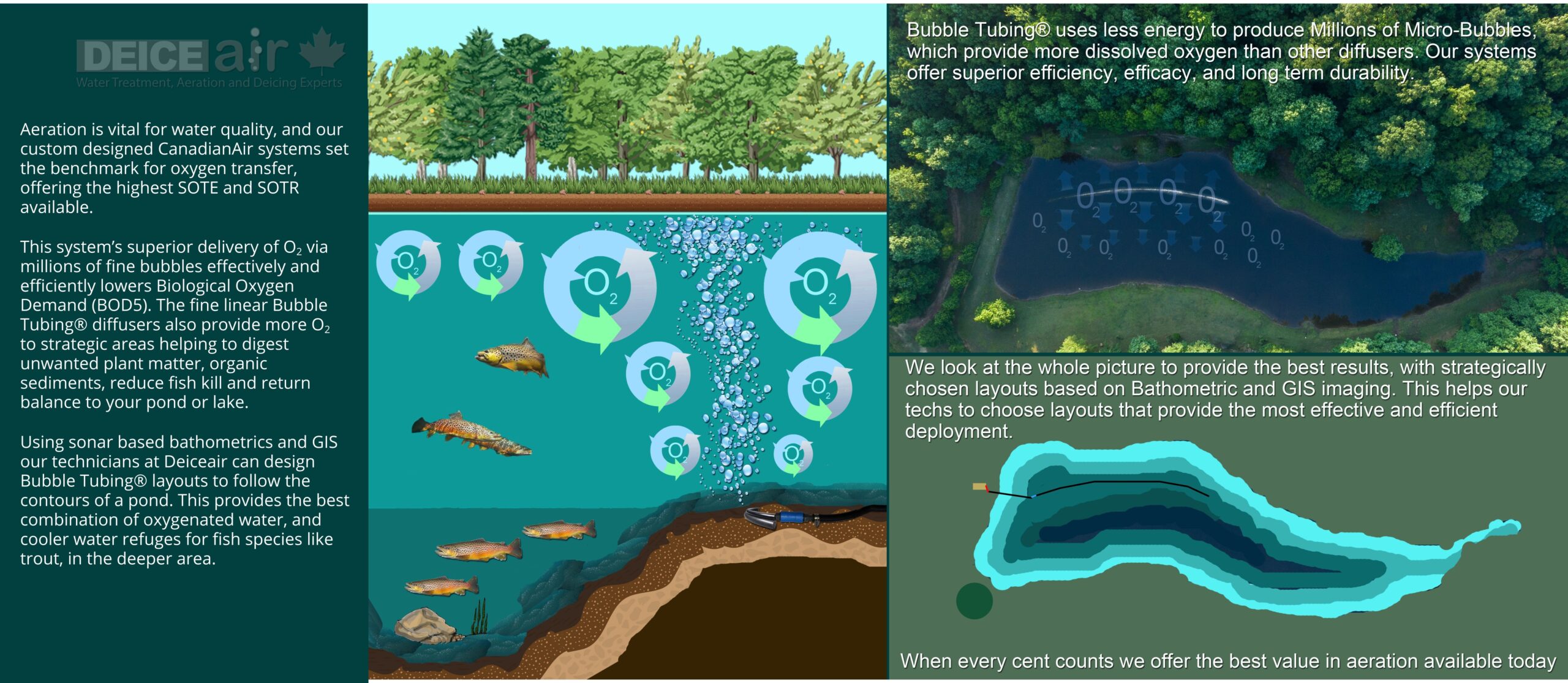 DEICEair also offers custom designed systems tailor fit to the size, depth, and contours of your pond, using GIS and bathometrics.